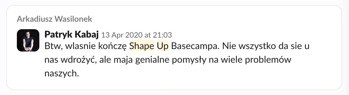 Overall, I think Shape Up is great and it helped me get out of a crisis I got my product org into. Here's a short story how it happened. It was early 2020, the beginning of a year. Our current ways of working could no longer handle the complexity of our products and growing organisational structure. We finished planning Q1 well past the middle of Q1. On a cold January evening, I had a sobering realisation: our planning was derailed, and the team was unlikely to deliver anything meaningful by quarter's end. Everything was going sideways. I sent a frank, transparent message to my five co-founders telling them we won’t make it and set out to fix this mess.